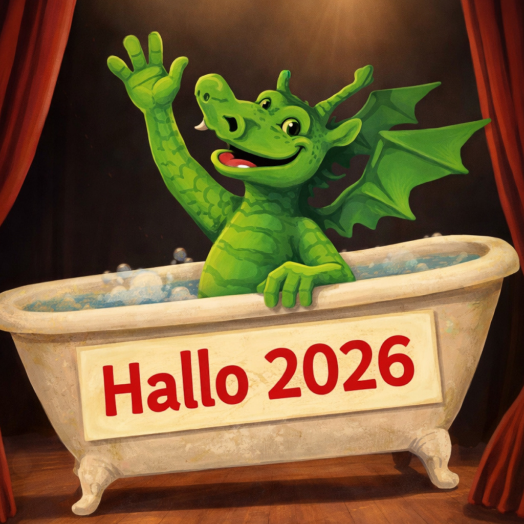 Mit einem fröhlichen Winken aus der Badewanne begrüßt unser Drache Amadeus das neue Jahr.